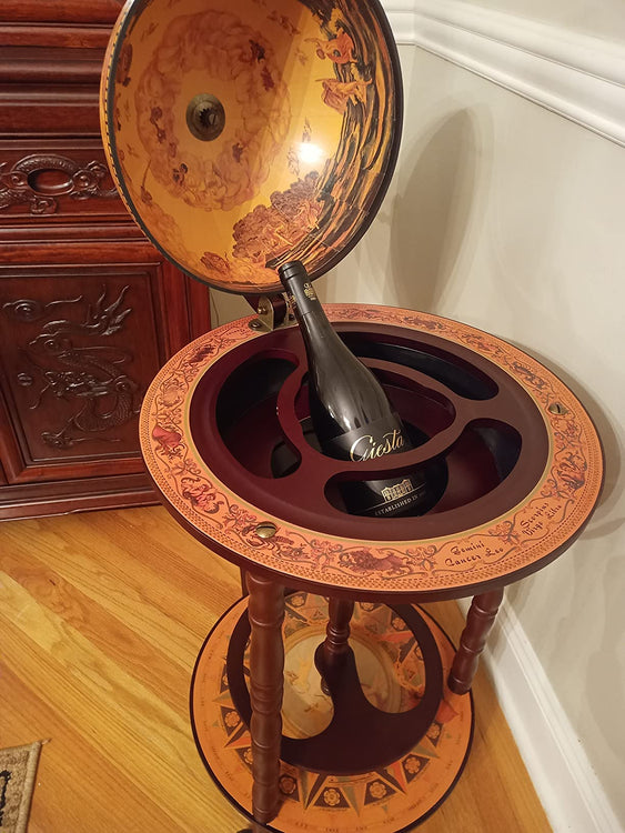 Our globe bar features a two-tier storage design for six bottles and glasses, smooth-rolling silent casters for easy repositioning, and a hand-painted exterior map with a Renaissance fresco inside for artistic flair.