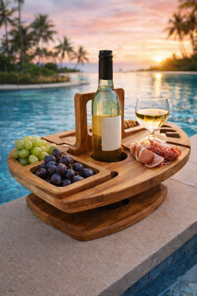 Foldable legs collapse flat, so you can pack it anywhere. Varnished wood withstands moisture, while raised edges keep items secure. The removable wine glass holder and rubber feet enhance stability on any surface.